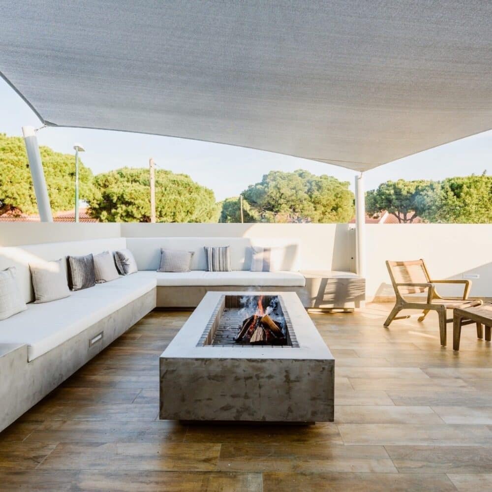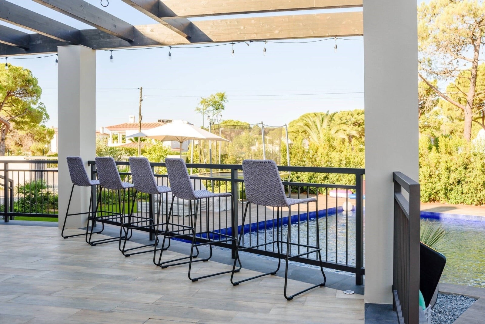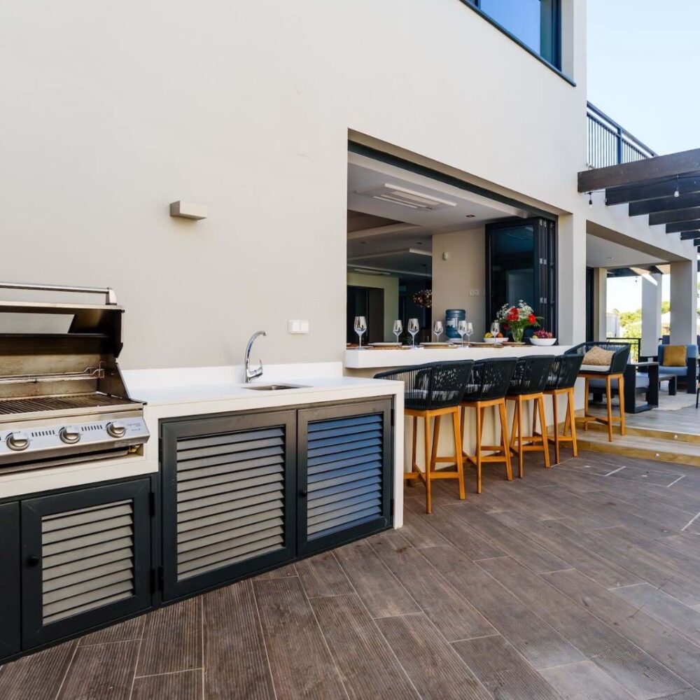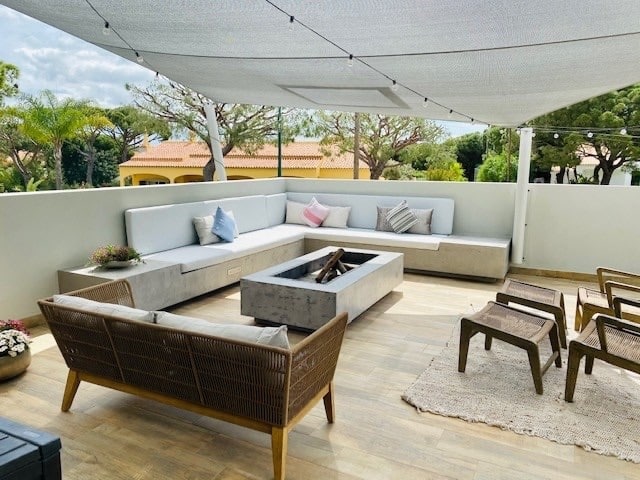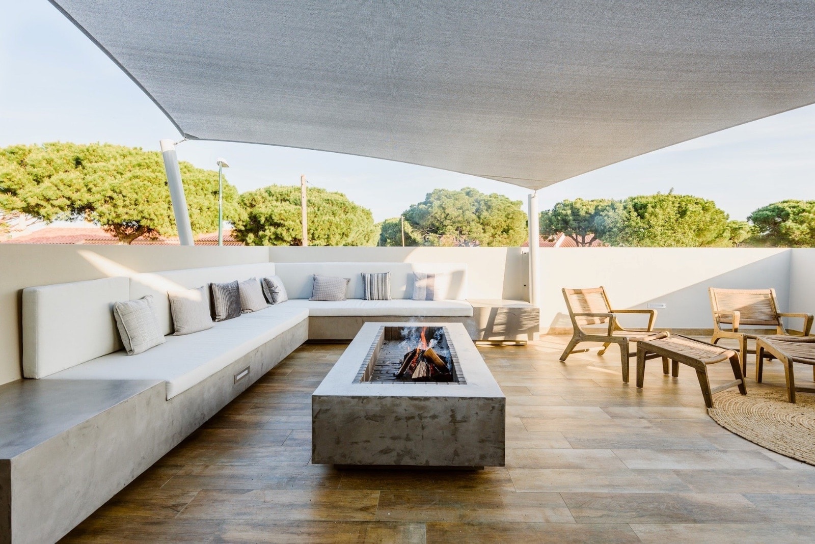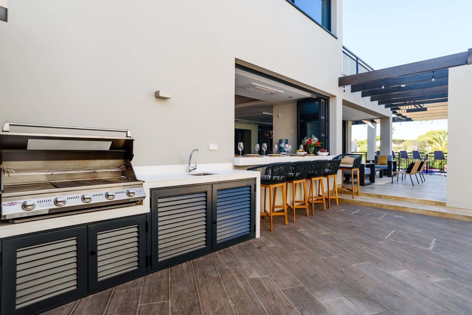Outdoors, this fully fenced property offers beautifully landscaped gardens with **automatic irrigation**, a **large heated swimming pool**, and extensive terraces for sunbathing and entertaining. A **barbecue area** and **alfresco dining space** make it perfect for hosting gatherings, while the **first-floor terrace** features built-in seating, a fire pit, and stunning sunset views across Vila Sol.