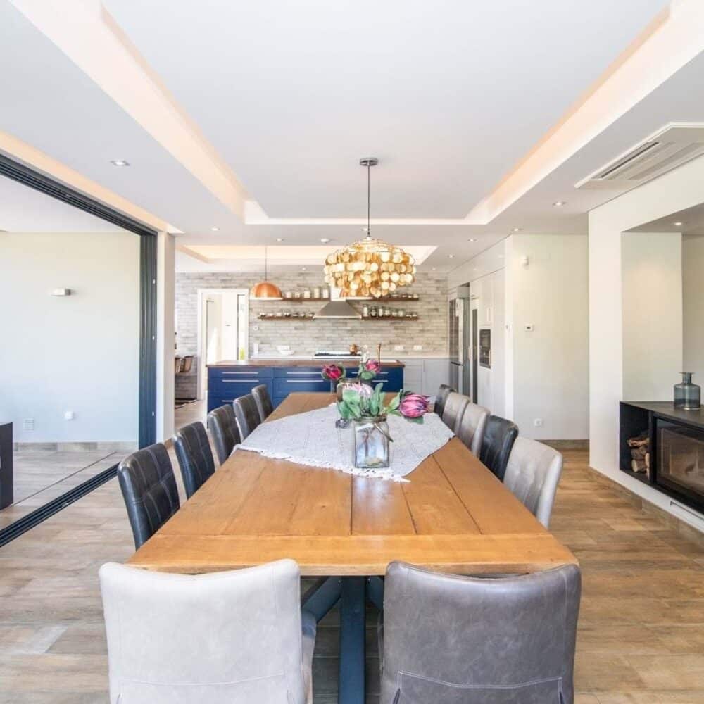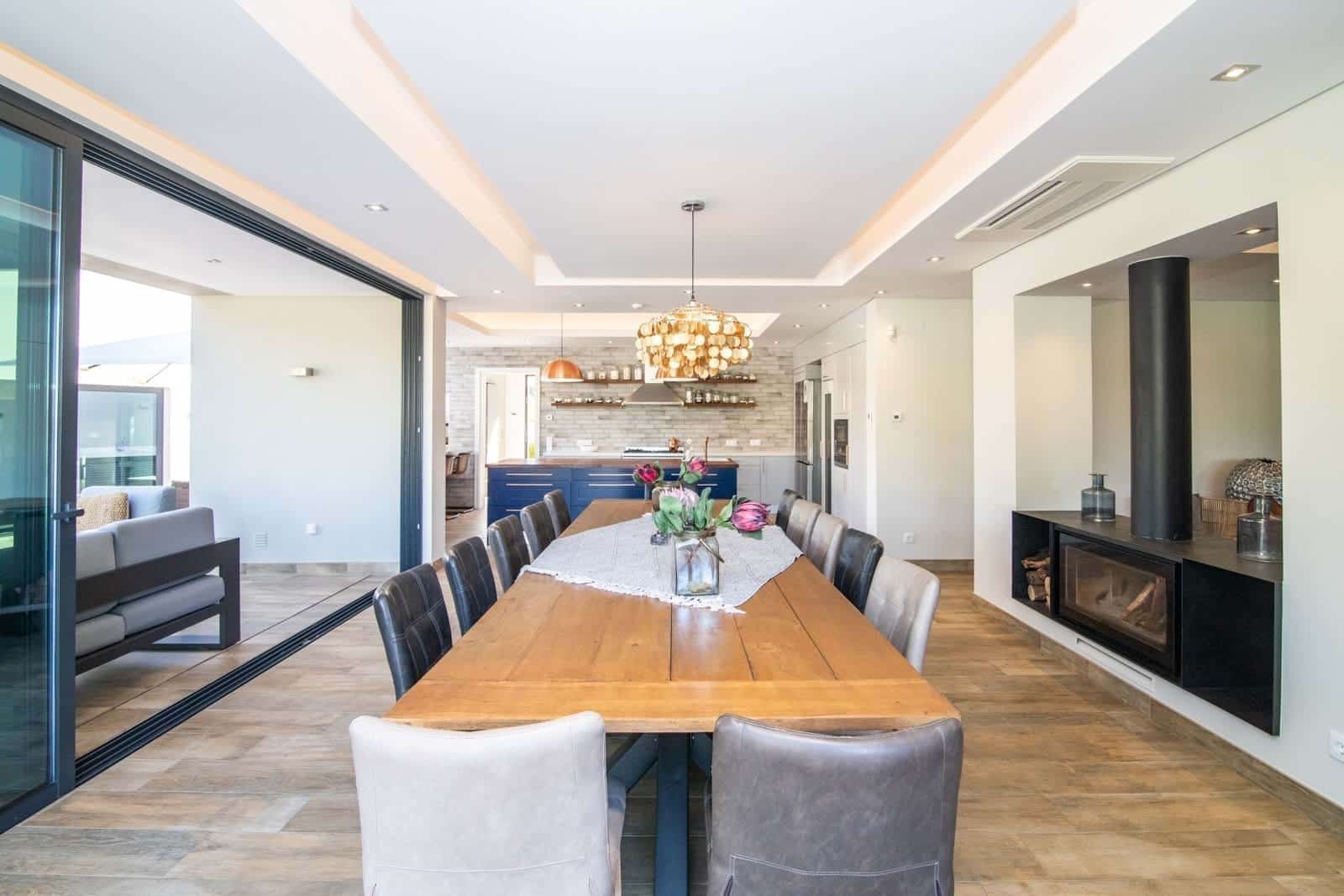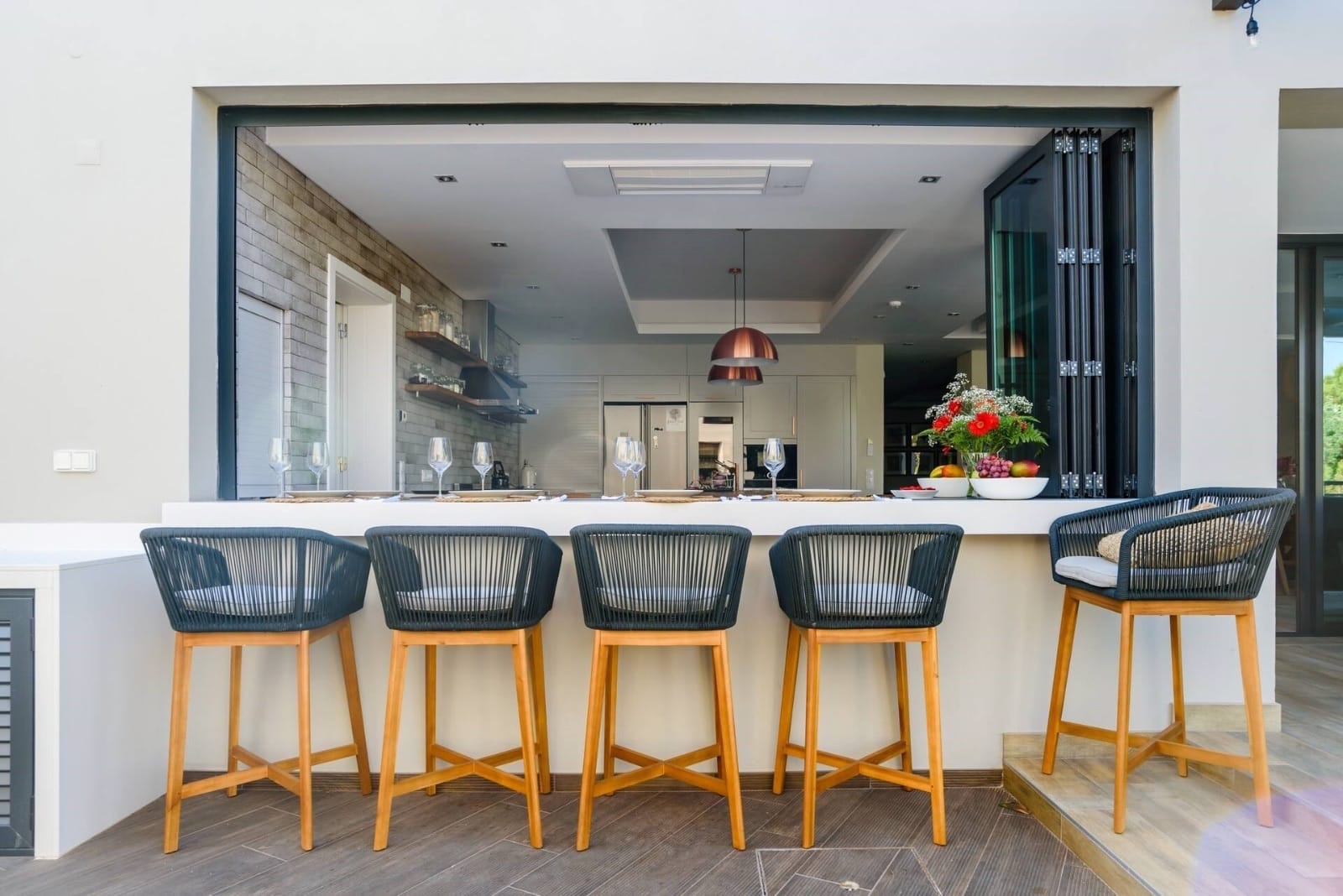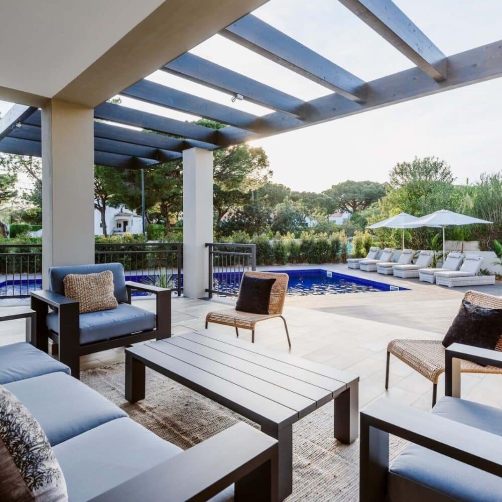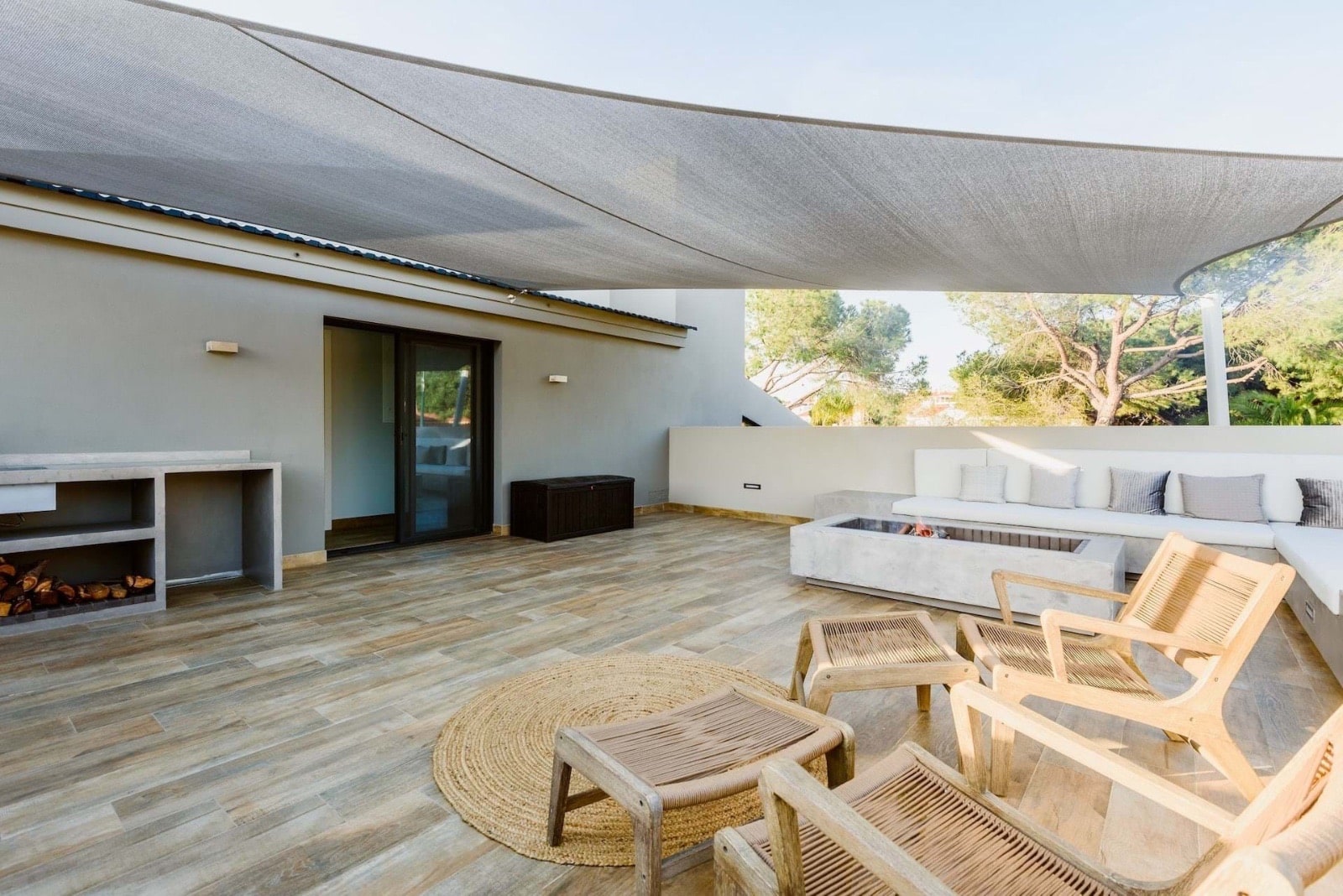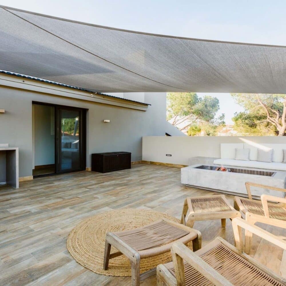 Outdoors, this fully fenced property offers beautifully landscaped gardens with **automatic irrigation**, a **large heated swimming pool**, and extensive terraces for sunbathing and entertaining. A **barbecue area** and **alfresco dining space** make it perfect for hosting gatherings, while the **first-floor terrace** features built-in seating, a fire pit, and stunning sunset views across Vila Sol.